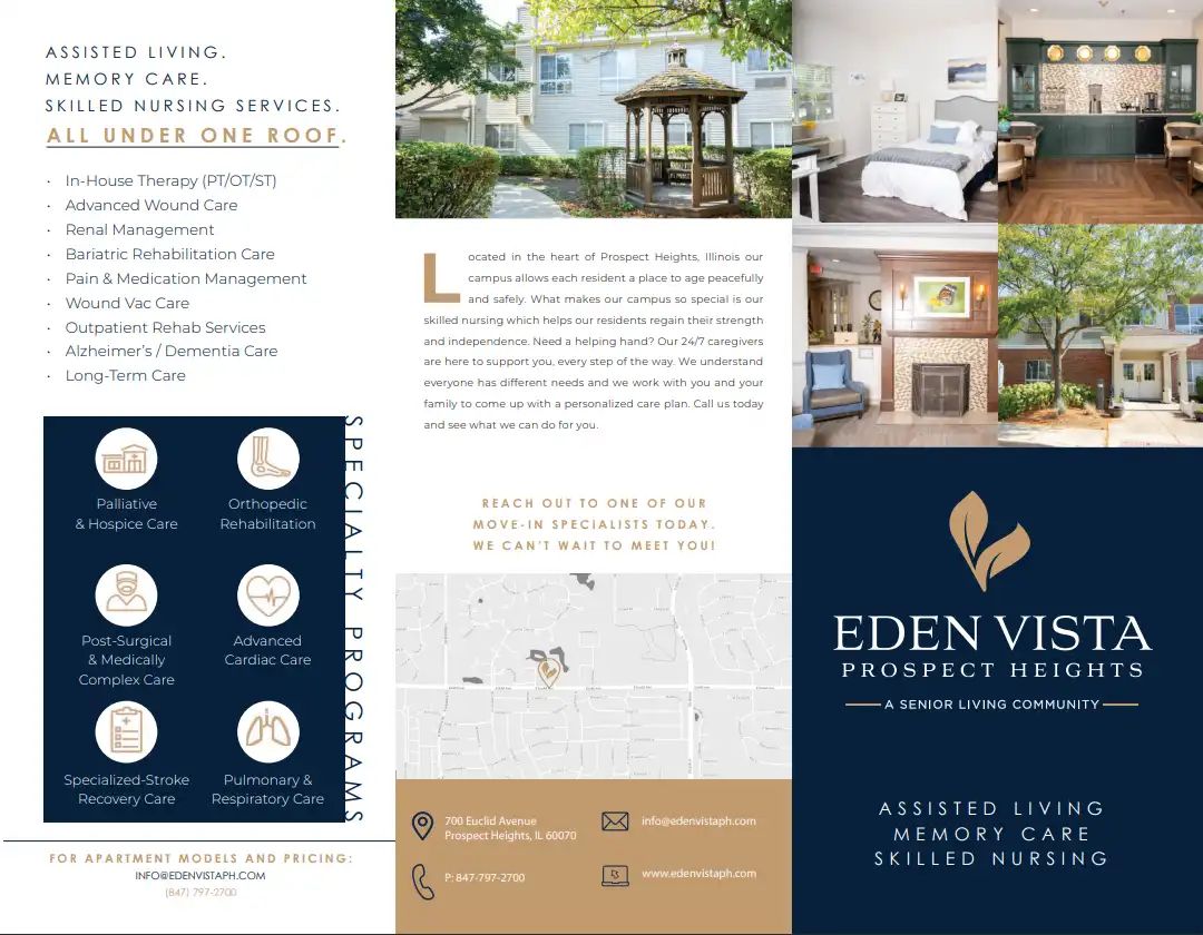 Eden Vista Prospect Heights is a proud member of the Vista Senior Care network. Vista is a dedicated branch tailored specifically for the senior communities. Specializing in Assisted Living, Memory Care, Vista ensures unparalleled personalized care and 24-hour assistance for their residents assuring residents a consistent and exceptional experience.